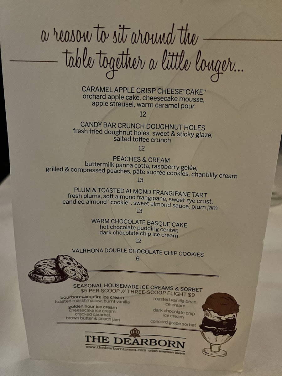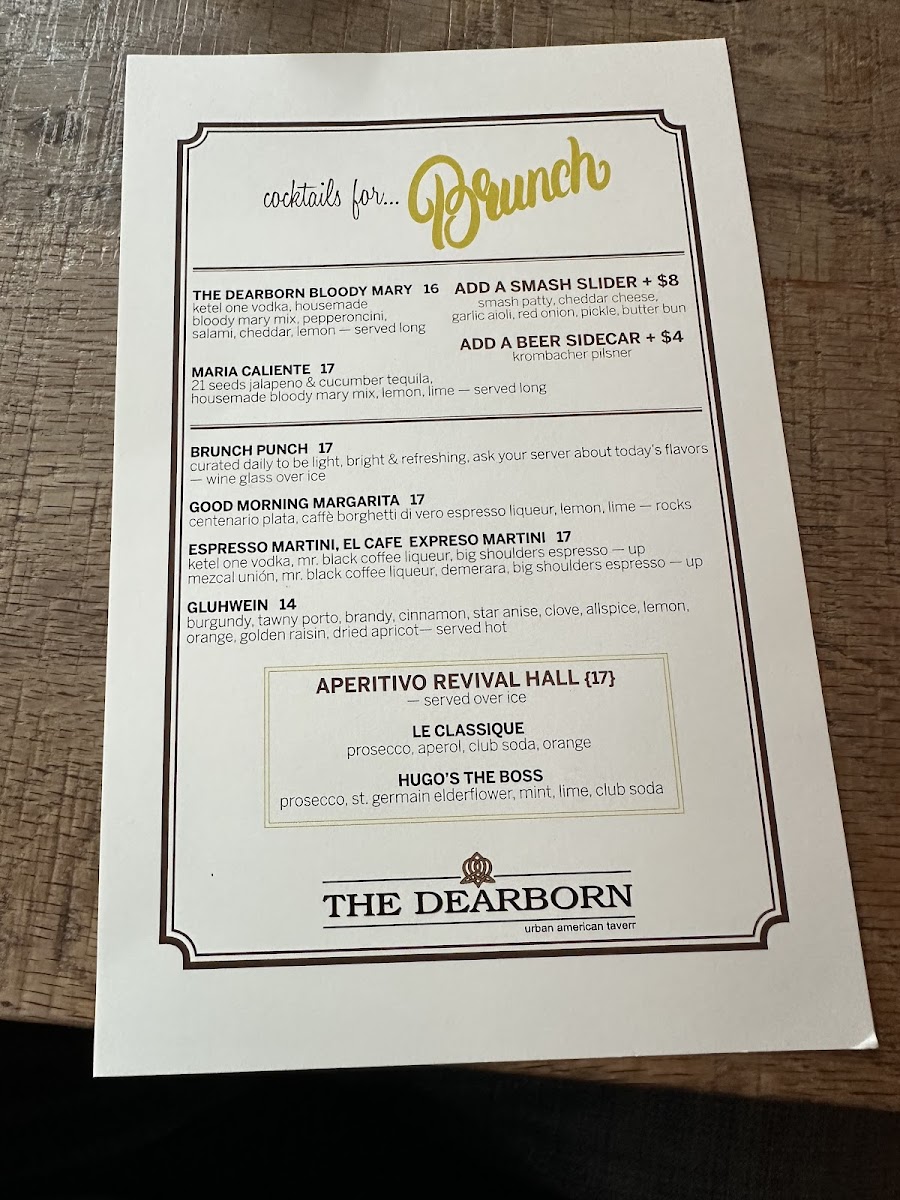 We had a great time at The Dearborn. The food was solid overall—especially the Brussels sprouts, which were absolutely amazing and packed with flavor. The drinks were another highlight: well-crafted and creative without being over the top. We ended the meal with cookies, which were good but didn’t quite reach the same level as the rest of the meal. Still, the overall vibe and quality made it a worthwhile stop. Would definitely go back for the drinks and those Brussels sprouts alone.