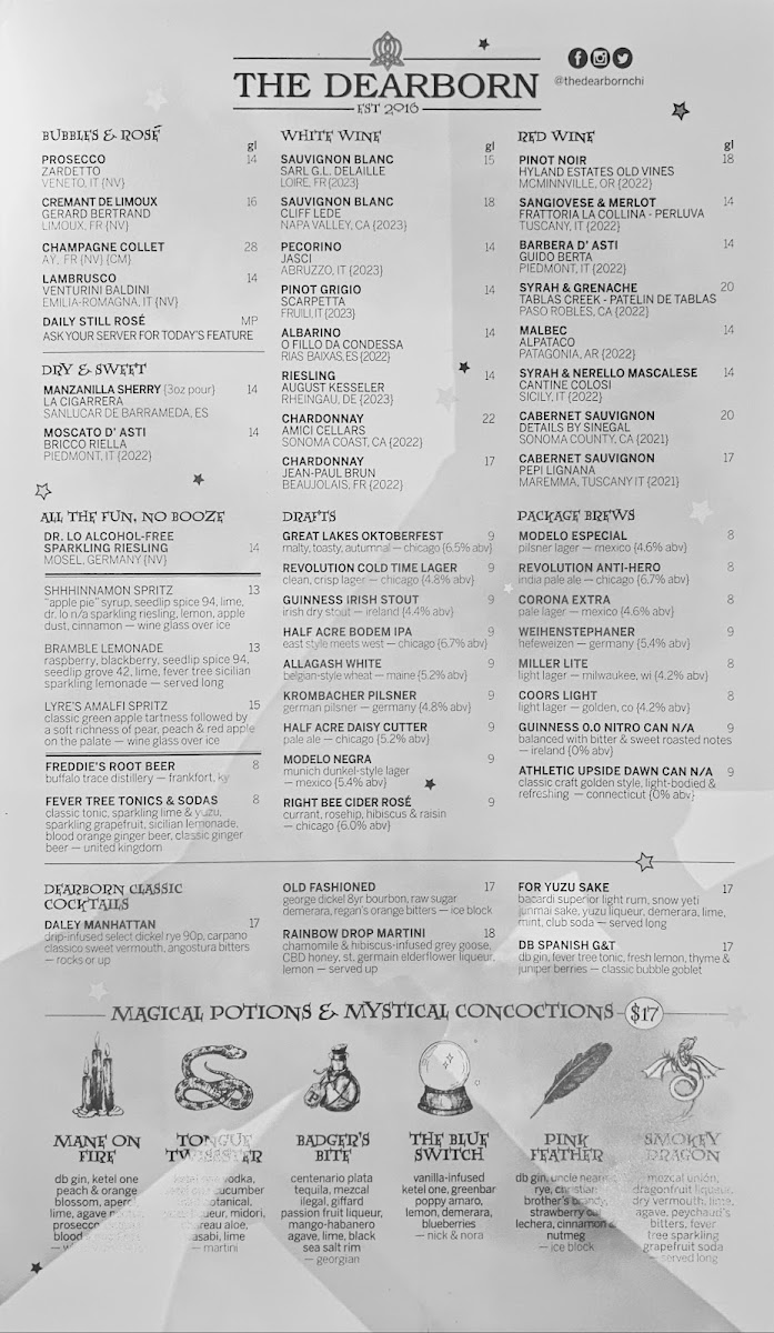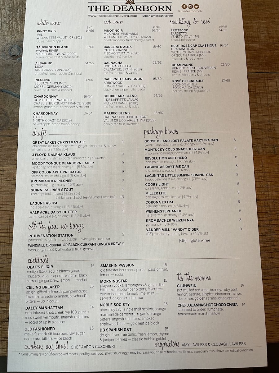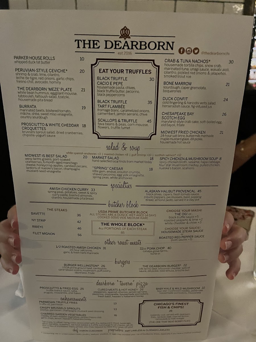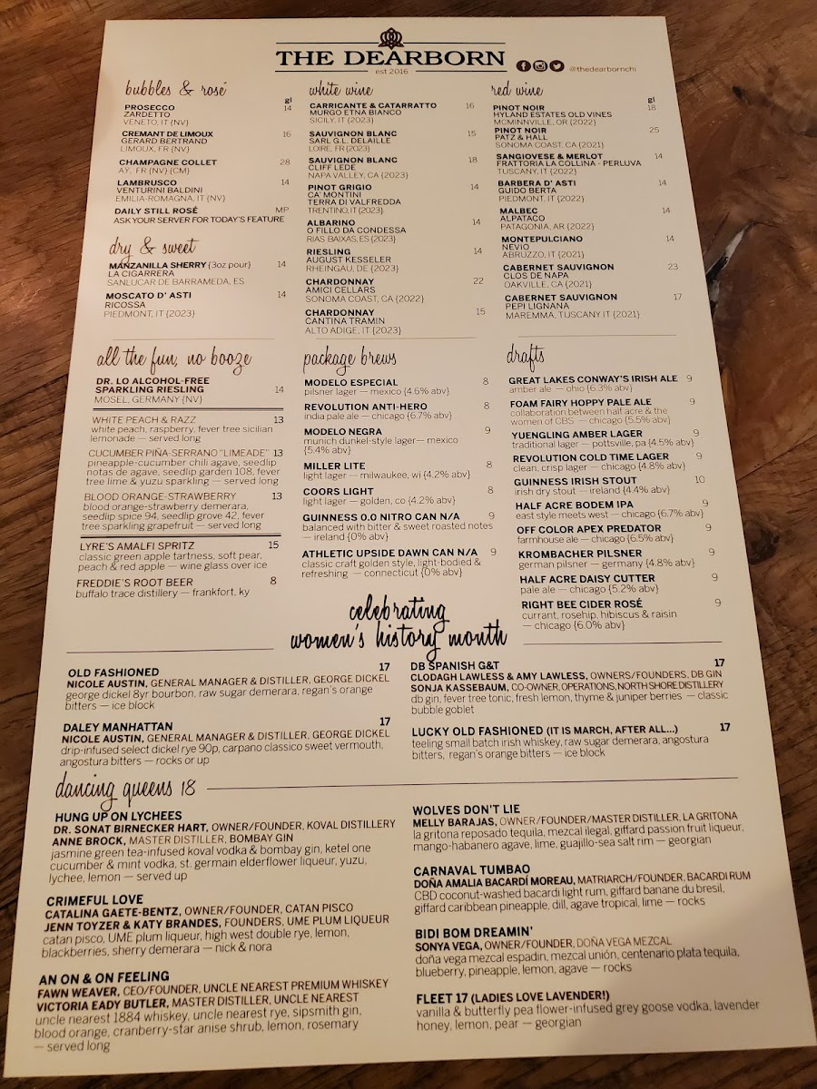 Was staying in a nearby hotel and was desperate for a good meal after a long day of travel and The Dearborn did not disappoint. I highly recommend getting the prosciutto croquettes - they were incredible. As a big tequila and mezcal fan I was appreciative of the variety of tequila based cocktails they had. I really enjoyed the wolves cocktail. The strawberry rhubarb dessert was a little too tart for me but it had potential so this one was probably just a subjective miss. The mashed potatoes was melt in your mouth good and the steak was perfect. Service on the water refill was so on point! And lastly the ambiance and vibes were also a plus. All in all a great spot.